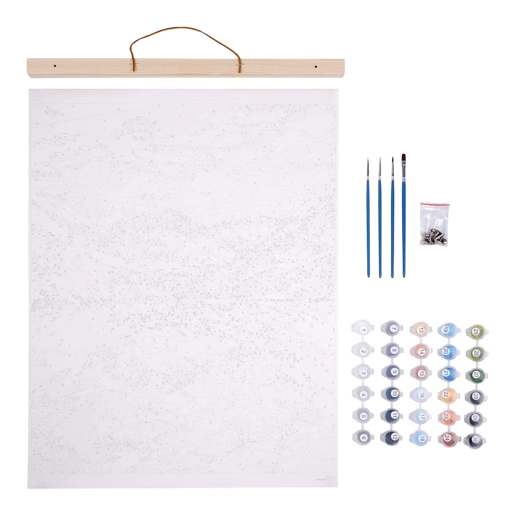 Create your own masterpiece with this breathtaking paint-by-number kit mountain scene. The package includes everything required to create a stunning image to display on your living room wall.