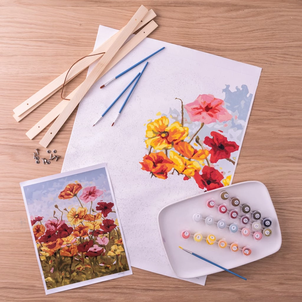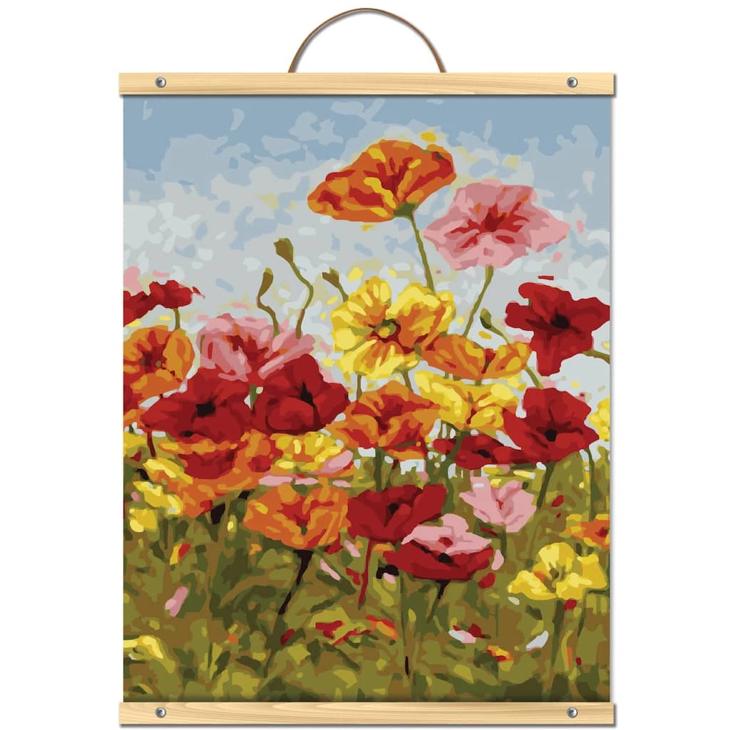 This poppy field paint-by-number kit is a fun, simple, and relaxing activity for teens, adults, and seniors! There is no previous experience with art or painting needed. Simply match the numbered paint pots with the numbered sections. Secure the completed painting on the included wooden display hanger, and mount it on your living room wall for all to see.Β