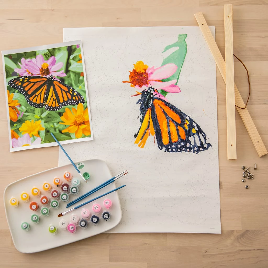 Paint a vibrant picture of a butterfly with the supplies included in this paint-by-number kit. Proudly display your completed masterpiece in the living room for pop of color.