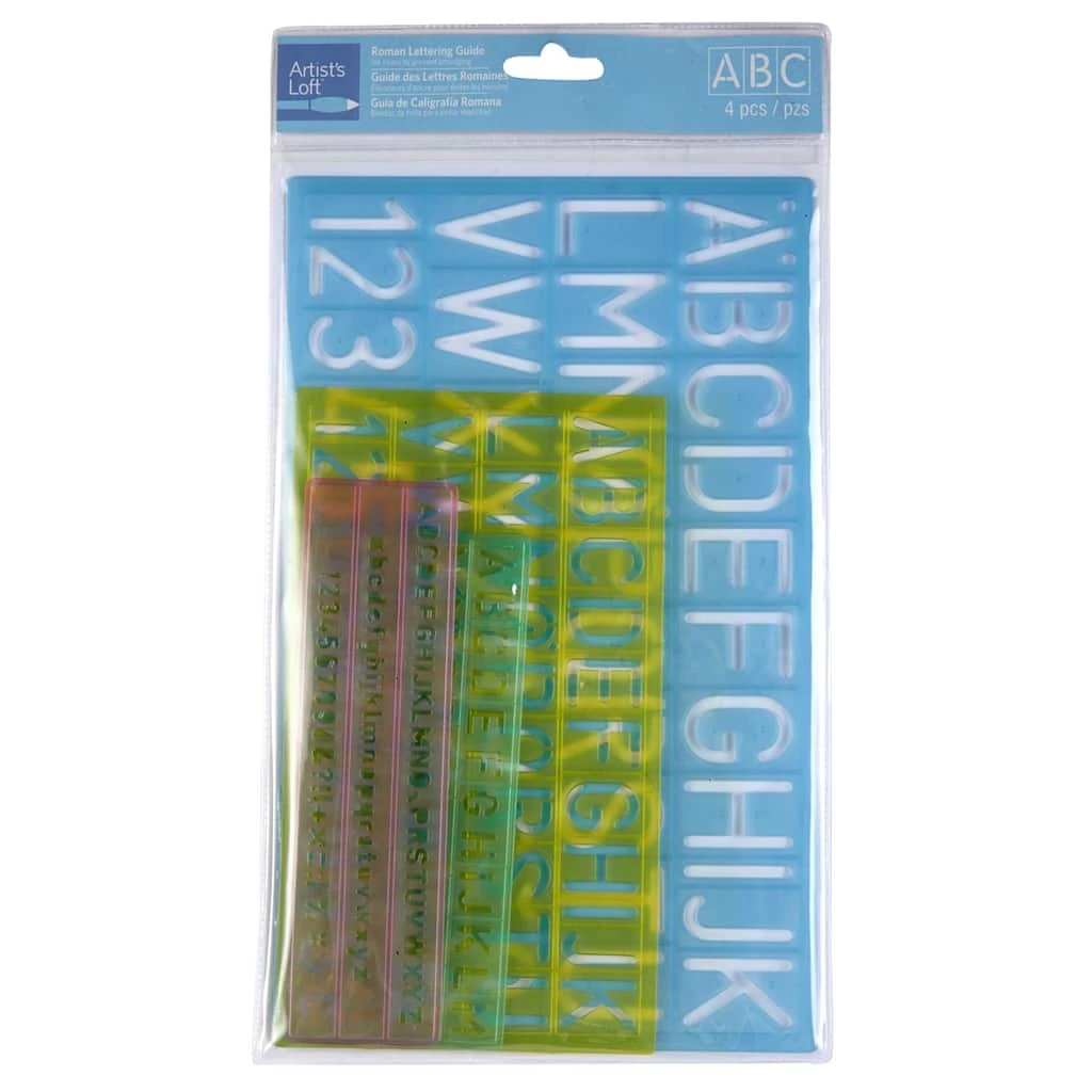 The Artist’s Loft lettering guide is ideal for tracing letters of different fonts and sizes for cards, decorations and other craft projects. Bring your inspiration to life with help from this four-piece template set.